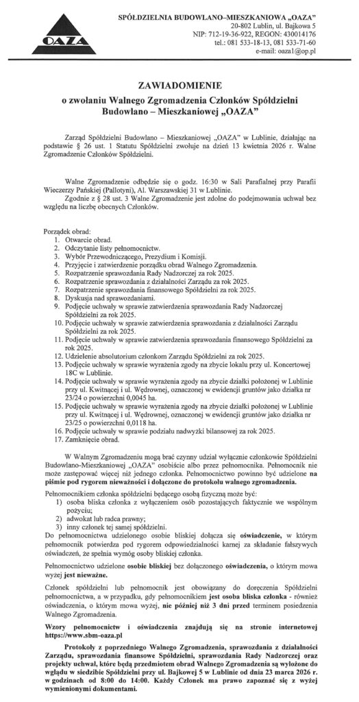 Walne Zgromadzenie Członków Spółdzielni 13.04.2026 r.